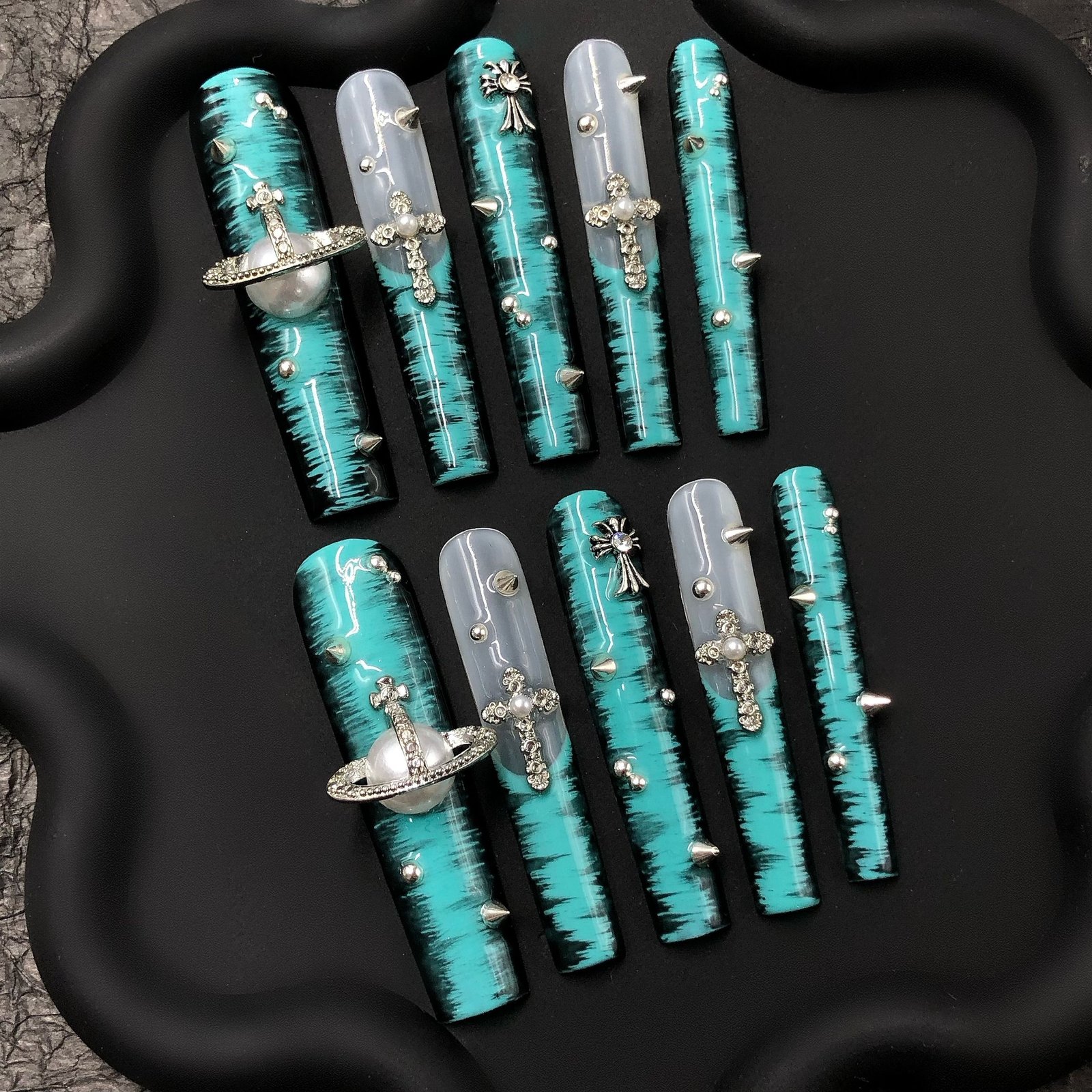 Teal Chrome Cross Press-On Nails with Studs and Planet Charm